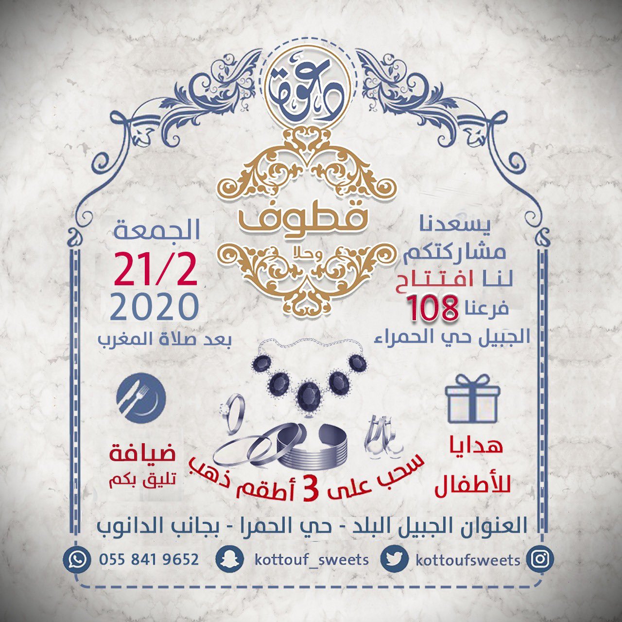 قطوف و حلا On Twitter يشرفناويسعدنا حضوركم افتتاح فرع 108 ولله الحمد في الجبيل الحمراء بجانب الدانوب يوم الجمعه الموافق2020 2 21 وسوف يكون قص الشريط بعد صلاة المغرب باذن الله